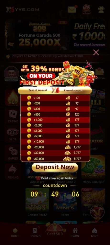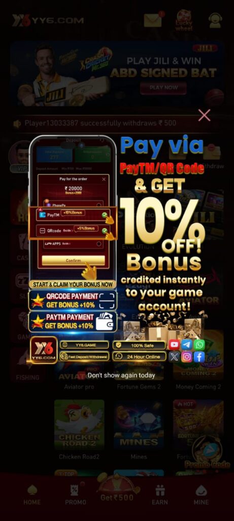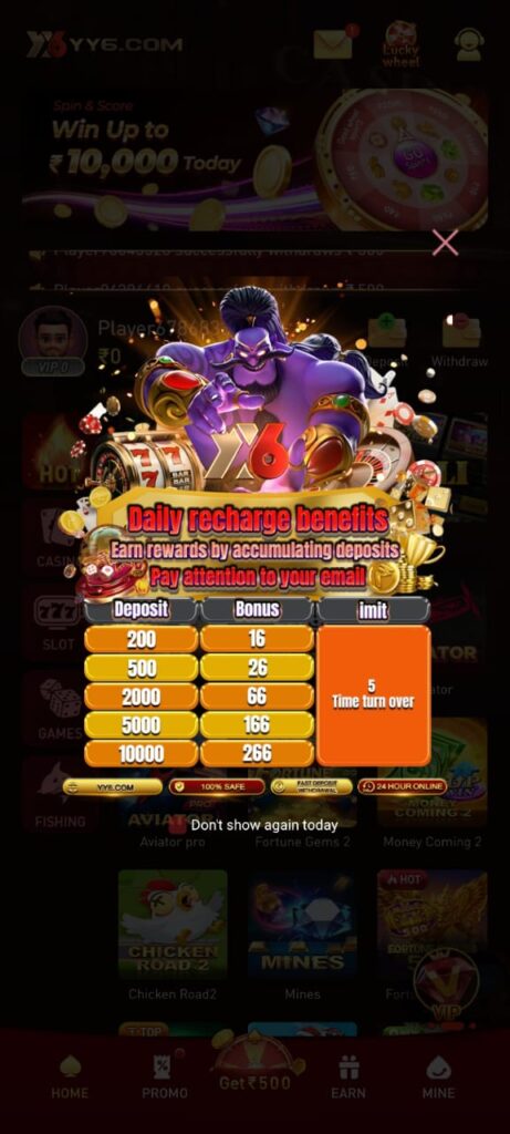 The Rs 500 welcome bonus is one of the biggest attractions of YY6 Game. New users often receive this bonus after completing registration and sometimes after making a small deposit. The bonus acts as a starting balance, allowing users to explore games without risking too much of their own money.